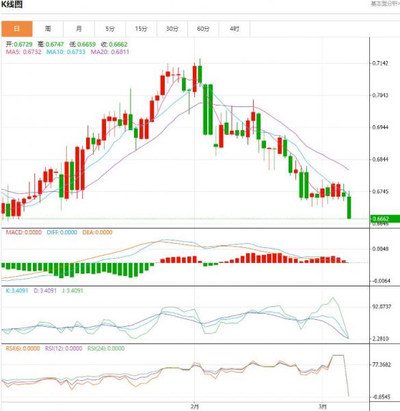 周二盘中,截止目前,澳元/美元货币对0.6665/0.6664,下跌至0.0067,跌幅1.00%。澳元/美元跌至10周低点,之前澳洲联储鸽派加息25基点。