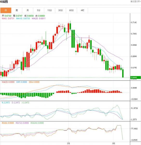 澳元继续下跌,周二大幅走低。欧洲时段,澳元/美元报0.6676,下跌0.81%。此前,澳元兑美元一度低见0.6674,为12月23日以来的最低水平。