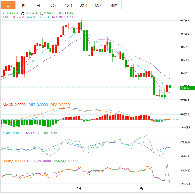 澳元兑美元的任何上行势头可能仍将受制于周一的高点0.6713附近,这是一个支撑位转变为阻力位,与日线图上始于2月份的下行趋势线相吻合。