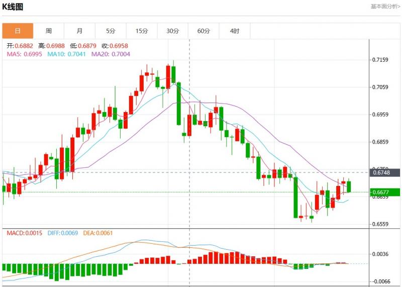 周二盘中,澳元美元报0.6677,跌幅0.57%。