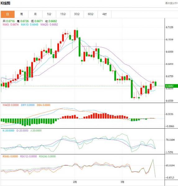 交易策略:可以在0.6770---0.6680的区间下限买入,有效破位40个点止损,目标在区间的上限。