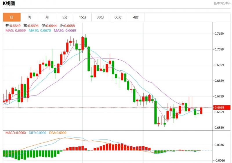 周二盘中,澳元美元报0.6687,涨幅0.59%。