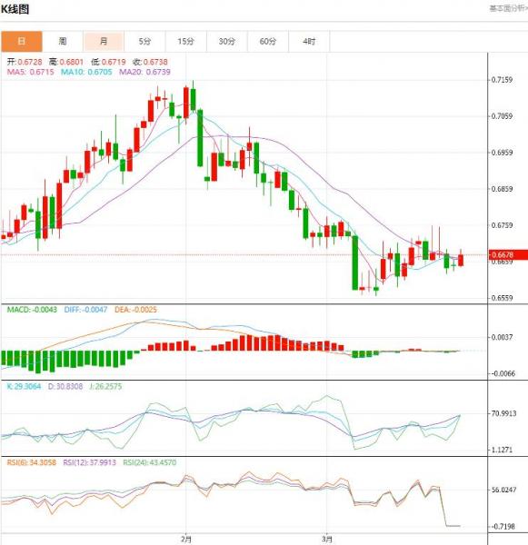澳元兑美元在欧洲交易于 0.6672,上涨 0.39%。澳大利亚零售销售微弱增长 0.2%,接下来将发布季度 CPI。银行业危机有所缓和,澳元等风险货币今天处于积极区域。