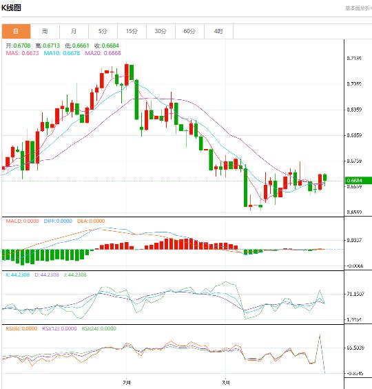 交易策略:可以在0.6755---0.6665的区间下限买入,有效破位40个点止损,目标在区间的上限。