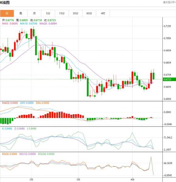 周五盘中,截止目前,澳元/美元货币对0.6724/0.6723,下跌至0.0051,跌幅0.75%。澳元兑美元在亚洲盘获买气,但0.6800暂时罩顶。