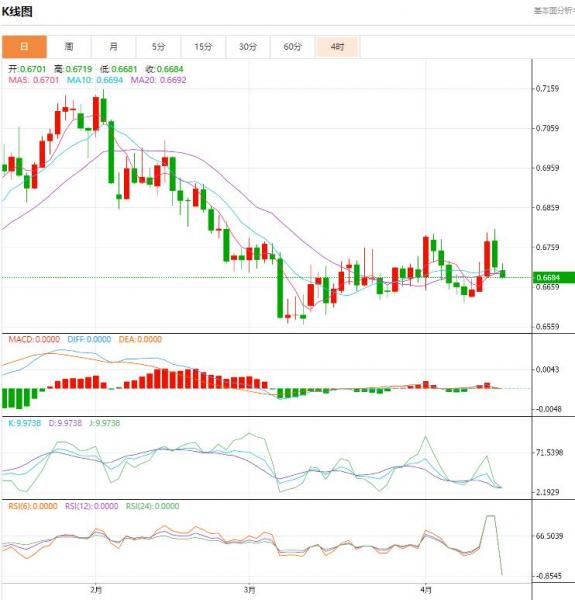 周一盘中,截止目前,澳元/美元货币对0.6688/0.6686,下跌至0.0022,跌幅0.33%。澳元兑美元近期面临进一步盘整。