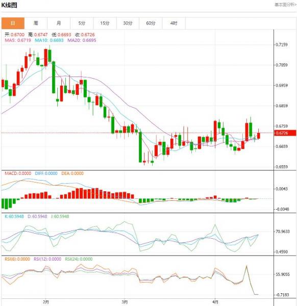 交易策略:可以在0.6720---0.6660的区间上限卖出,有效破位30个点止损,目标在区间的下限。