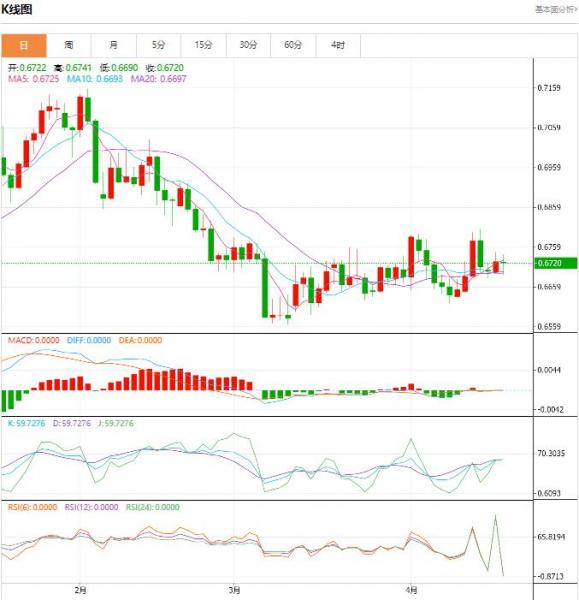 交易策略:可以在0.6780---0.6700的区间下限买入,有效破位35个点止损,目标在区间的上限。