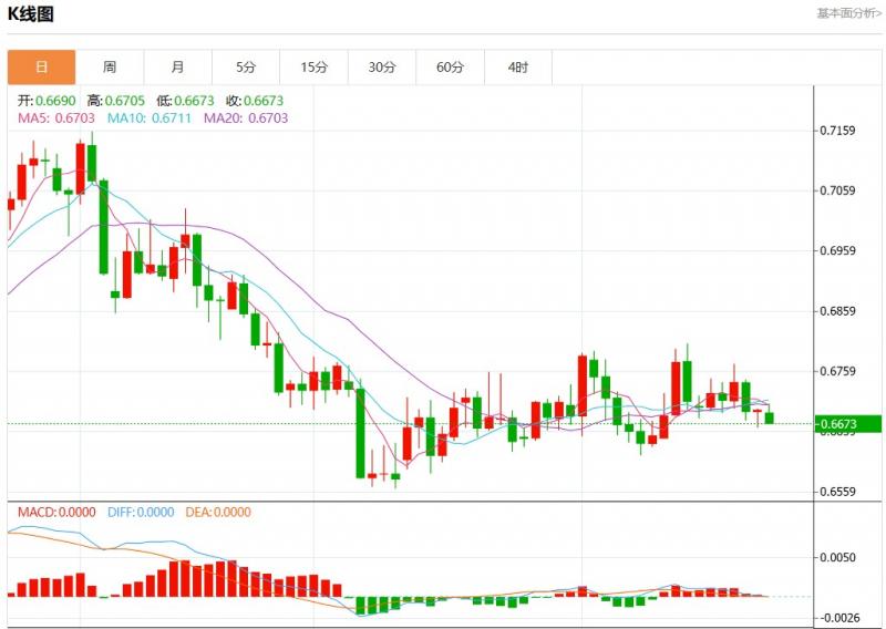 周二盘中,澳元美元报0.6674,跌幅0.33%。