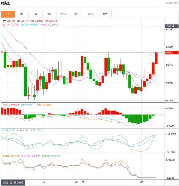 交易策略:可以在0.6800---0.6710的区间下限买入,有效破位40个点止损,目标在区间的上限。