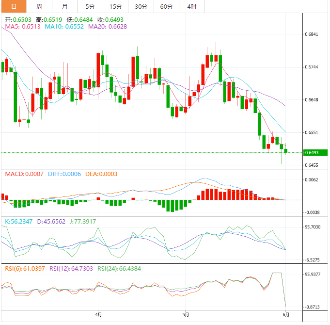 澳元基本面:由于市场情绪谨慎乐观,围绕美联储的担忧不一唤醒多头,澳元兑美元在0.6520附近录得三日内首日上涨。不过,然而,迫在眉睫的美国就业线索和参议院即将对美国债务上限法案进行的考验了澳元多头。值得注意的是,中国5月份乐观的财新制造业PMI也为该货币对的上行提供了支撑。