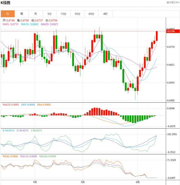 澳元继续上涨,交易价格为 0.6775,当日上涨 0.35%。澳元在 6 月表现强劲,兑美元汇率飙升 4.15%。