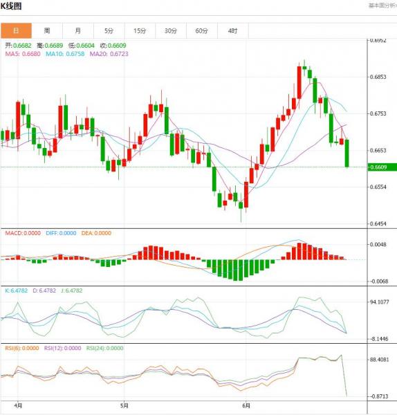 周三澳元大幅走低。欧洲时段,澳元/美元报0.6636,下跌0.75%。此前,澳元兑美元触及0.6618低点,为6月7日以来的最低水平。
