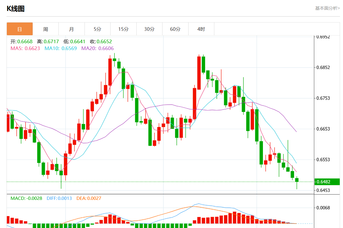 周一盘中,澳元/美元报0.6484,跌幅0.17%。
