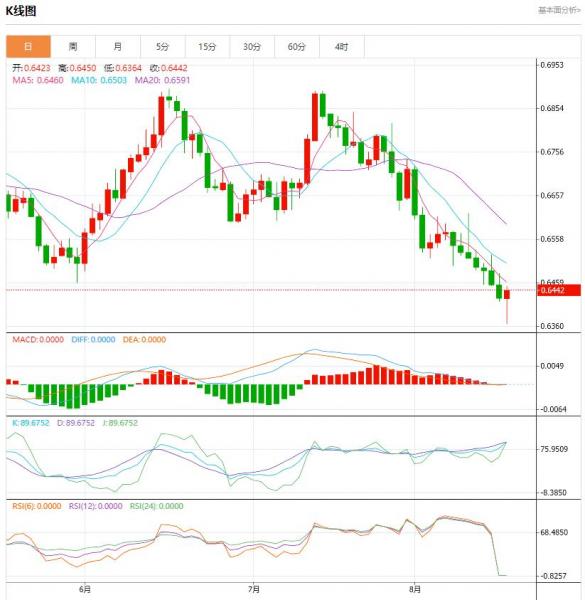澳元一直在严重下滑。此前,澳元/美元一度跌至九个月低点0.6364,随后有所回升。欧洲时段,澳元/美元报0.6433,上涨0.16%。