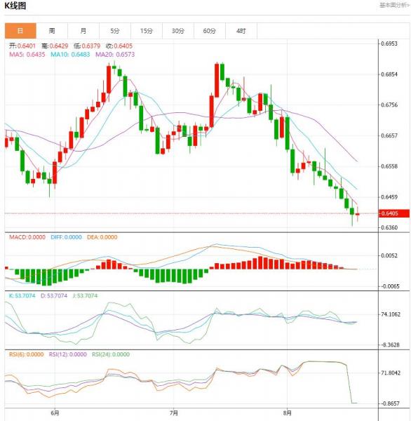 澳元兑美元已连续八天收低,期间下跌了230个基点。周五澳元/美元继续下行,欧洲时段澳元兑美元报0.6390,下跌0.20%。今天澳大利亚或美国没有数据发布,因此我预计澳元/美元将迎来平静的一天。