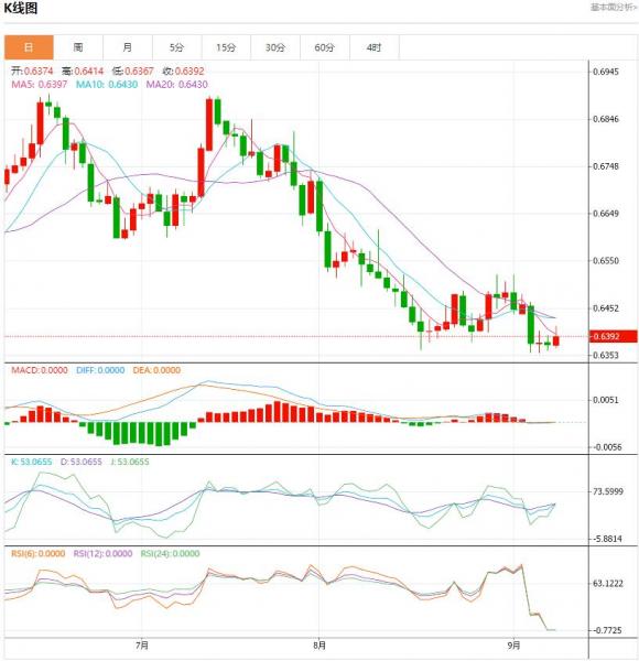 交易策略:可以在0.6405---0.6355的区间上限卖出,有效破位30个点止损,目标在区间的下限。
