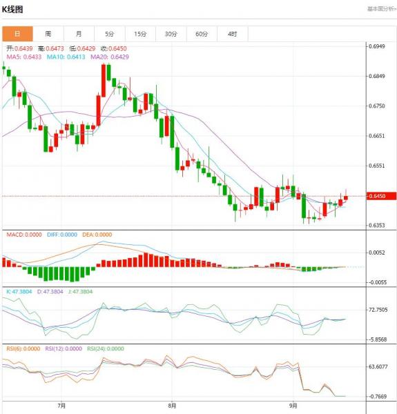 周五澳元小幅走高。欧洲时段,澳元/美元报0.6452,上涨0.18%。早些时候,澳元/美元触及0.6473高位,为9月4日以来的最高水平。