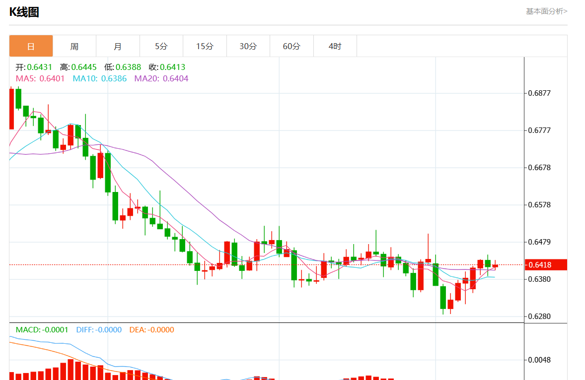 周四盘中,澳元/美元报0.6414,涨幅0.02%。