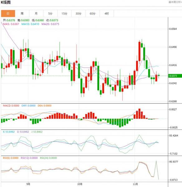周二澳元小幅走低。欧洲时段,澳元/美元几乎没有变化,交投于0.6376。