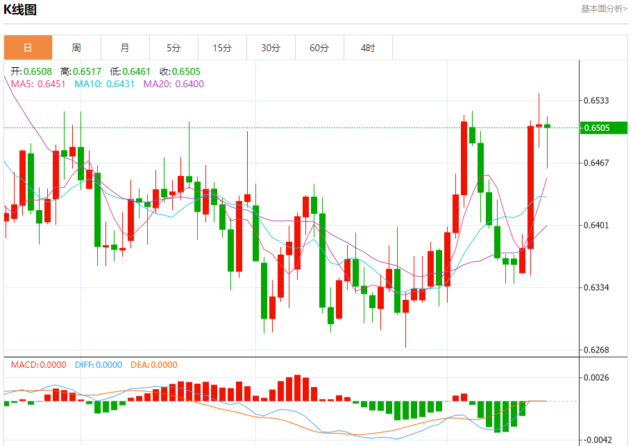 今天的预期交易区间在0.6410支撑和0.6500阻力之间