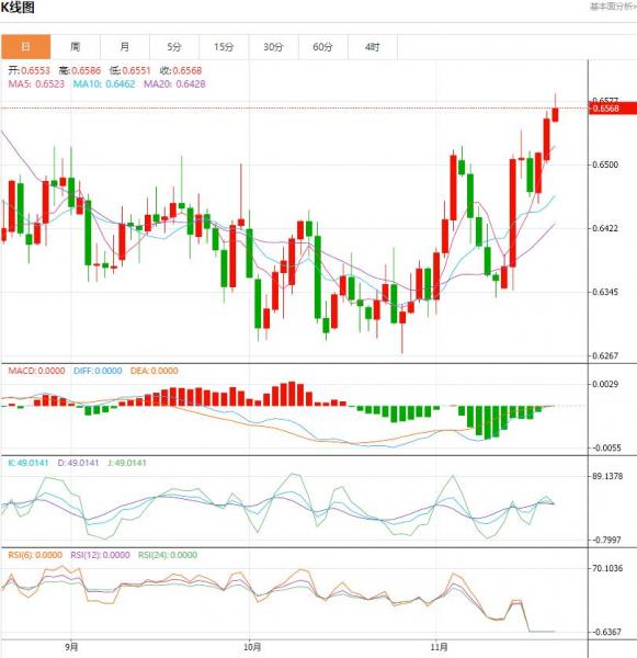 澳元继续上涨。欧洲时段,澳元/美元报0.6567,上涨0.15%。澳元走势强劲,自 11 月 14 日以来上涨超过 3%。