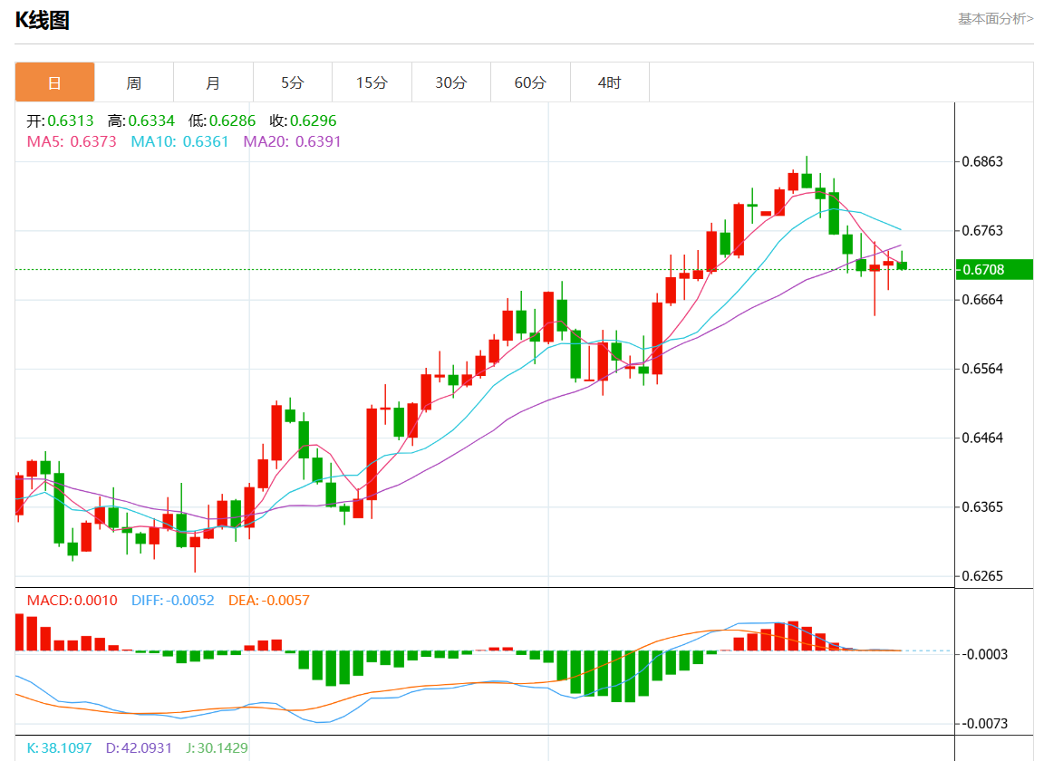 周二盘中,澳元/美元报0.6708,跌幅0.16%。