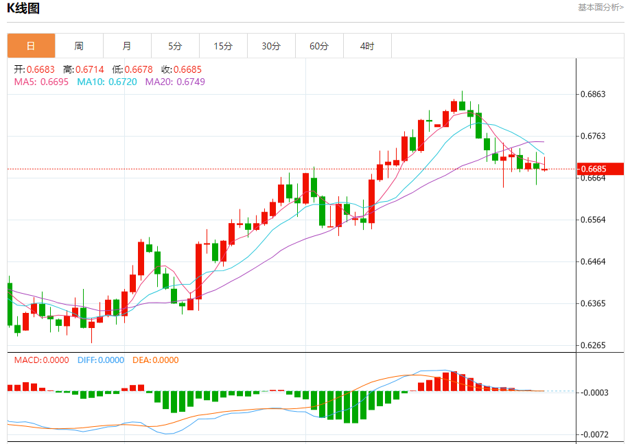 今天的预期交易区间在0.6670支撑和0.6770阻力之间