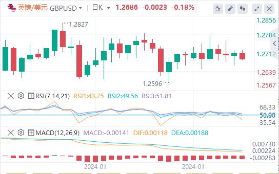 技术面由50天和200天指数移动平均线(EMA)分别位于1.27068和1.26721决定。50EMA高于当前价格表明前景中性至看跌,而低于价格水平的200EMA则发出略微看涨的信号。