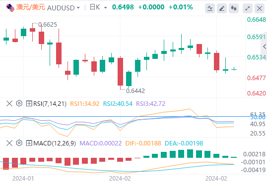 上行方面,若澳元/美元突破周线产0.6595(2月22日)后,可能会重测临时55日均线0.6623,该均线与1月下旬高点(1月30日)汇合。若澳元/美元突破该区间,则可能触及2023年12月的高点0.6871(12月28日),随后是2023年7月的高点0.6894(7月14日)和2023年6月高位0.6899(6月16日),然后是0.7000这一重要关口。