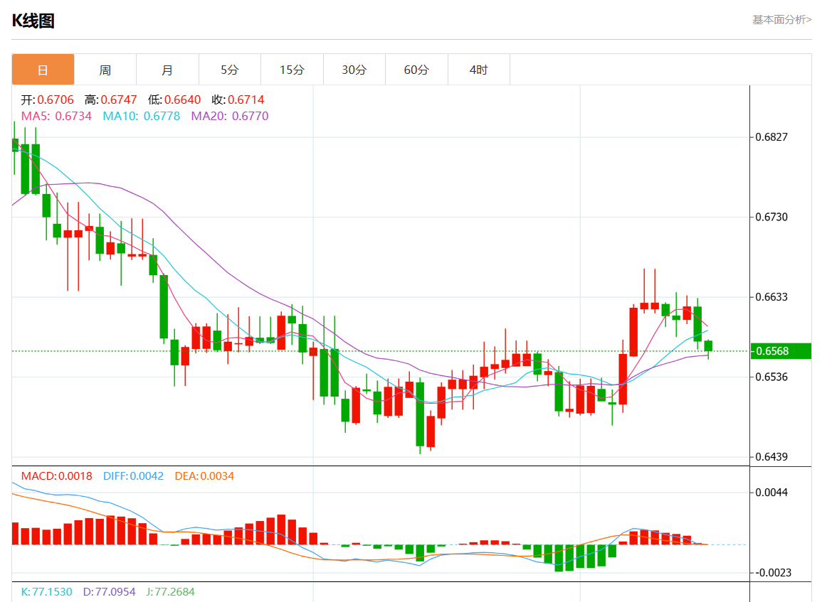 周五盘中,澳元/美元报0.6567,跌幅0.20%。
