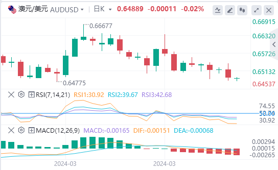 澳元/美元跌破0.65美元的关口可能会使0.64582美元的支撑位发挥作用。澳元/美元的14周期每日RSI读数为39.84,在进入超卖区域之前可能会跌破0.64582美元的支撑位。