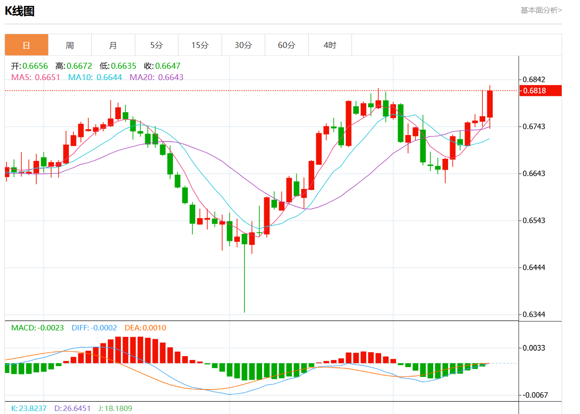 周四盘中,澳元/美元报0.6820,涨幅0.83%