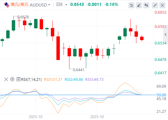 主要支撑位在0.6544的九日均线。跌破该水平将削弱中短期价格动能,并促使澳元/美元在矩形下边界0.6450附近徘徊,随后是四个月低点0.6414