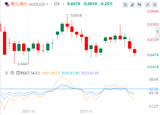 然而,随着国内就业数据强劲,澳元获得支撑,增强了澳大利亚储备银行(RBA)对谨慎立场的预期。截至11月14日最新更新,澳交所2025年12月30天银行间现金利率期货交易为96.41,反映即将召开的澳储银行董事会会议下调利率从3.60%降至3.35%的概率为6%。