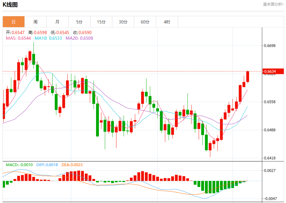 RSI若高于60,则支持上涨,只有在反转时才会转为谨慎。20日均线均线0.6542支撑;日内收盘若跌破该线,可能使市场偏向修正回调。上行方面,如果澳元货币对突破0.6629大关,有望上涨至9月18日的高点0.6660,该关口为10月最高点。