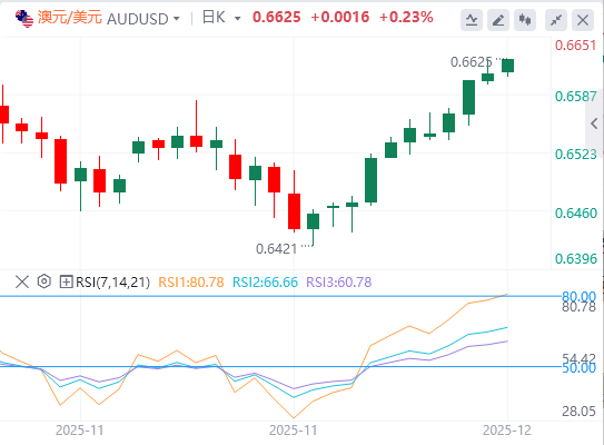 澳元/美元周五上涨至0.6622。20日指数移动平均线(EMA)上行,价格稳守其上方,强化了多头基调。20日EMA的距离表明趋势延伸,而非均值回归。