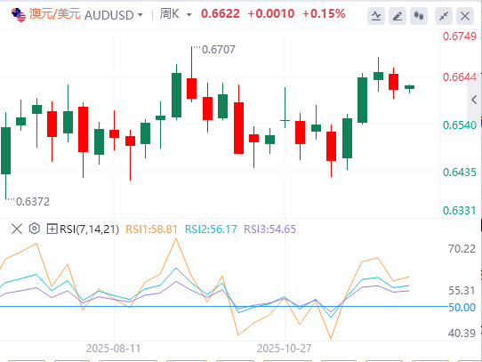 澳元/美元汇对徘徊在九日均线0.6620附近。持续突破该水平将增强短期动能,为3个月高点0.6685和0.6707打开道路,后者为2024年10月以来最高点。下行方面,若果断跌破上升通道,可能加剧下行压力,暴露8月21日标记的6个月低点0.6414附近。