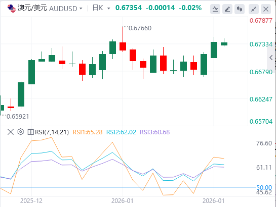 上涨方面,澳元兑美元汇率可能目标为15个月高点0.6766。近期支撑位于九日均线0.6712。若日收盘价跌破短期均线,50日均线0.6651可能成为初步支撑。进一步跌幅可能延伸至0.6414,为2025年6月以来最低水平。