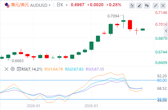 澳元/美元汇对周二交易约为0.6970。日线图分析显示该货币对保持在九天指数移动平均线(EMA)上方,显示持续的多头偏向。14天相对强弱指数(RSI)为70;它通常预示着多头动能,但动能正在拉长。