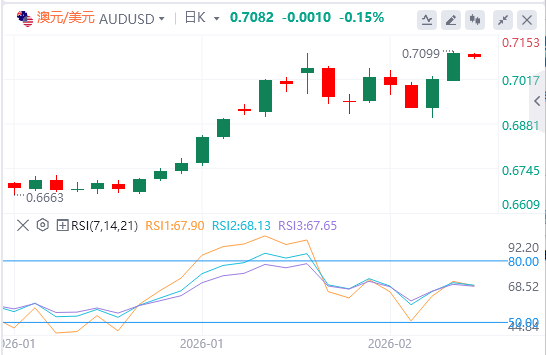 在1小时图上,周一从0.7010区域的反弹带来了干净利落的多头冲动,价格在较低时间框架上突破了50日均线和200日均线。从2月2日低点0.6958附近起,一条上升通道引导着上升,日内阻力位在上通道边界约0.7090至0.7100。随机振荡器正向1H超买区推进,暗示该货币对可能在再上一盘前盘整。短期支撑位于通道底部约0.7030,0.7000作为更强的结构性基础。若日收盘价回升至0.7094以上,将突破1月29日高点,打开通往0.7128及0.7200大关的通道。