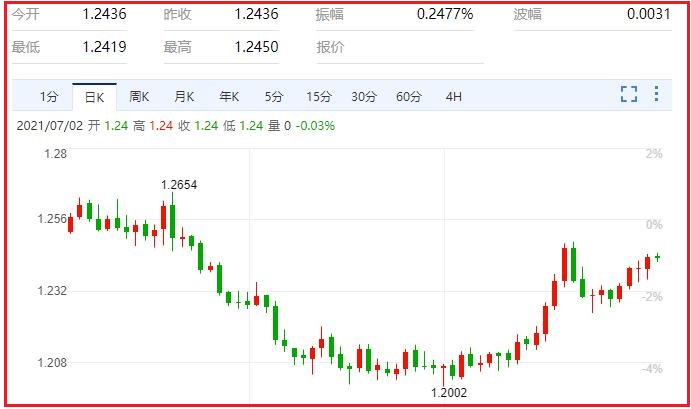 本交易日投资者将迎来美国非农就业报告,由于该数据对于美联储货币政策至关重要,因此受到投资者的高度关注。本周早些时候出炉的“小非农”ADP就业数据以及初请失业金人数数据表现优于预期,令市场对非农报告抱有乐观态度,有机构甚至提示非农就业增幅超过100万的风险。假如非农数据表现强劲,美元有望进一步大涨,汇价现报1.2432,跌幅0.04%。