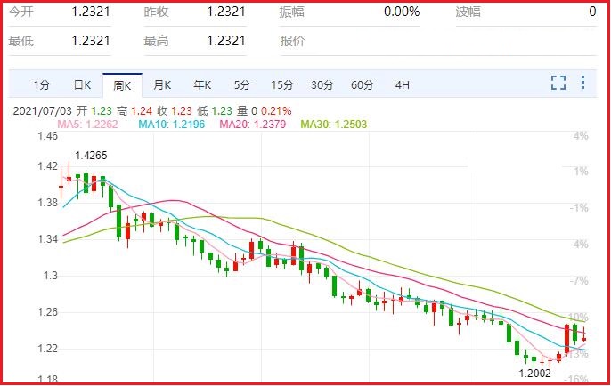 1.美元/加元货币对汇率本周涨幅0.24%,振幅1.32%,最高1.2450,最低1.2288,收于1.2325,周线收一小阳线;