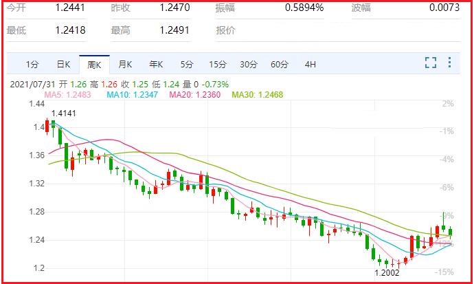 1.美元/加元货币对汇率本周跌幅0.86%,振幅1.46%,最高1.2606,最低1.2423,收于1.2469,周线收一中阴线;