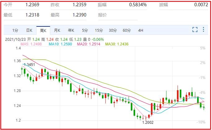 1.美元/加元货币对汇率本周跌幅0.06%,振幅0.99%,最高1.2410,最低1.2288,收于1.2356,周线收一阴星;