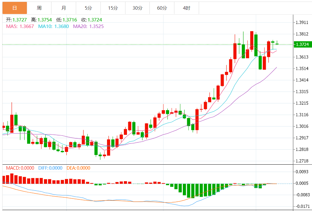 技术上,MACD信号看涨且美元/加元处在关键均线上方,仍让多头维持期待。也就是说,50均线1.3680附近所构成的三角形支撑加大动能,若汇价跌破该水平,将确认看跌形态。
