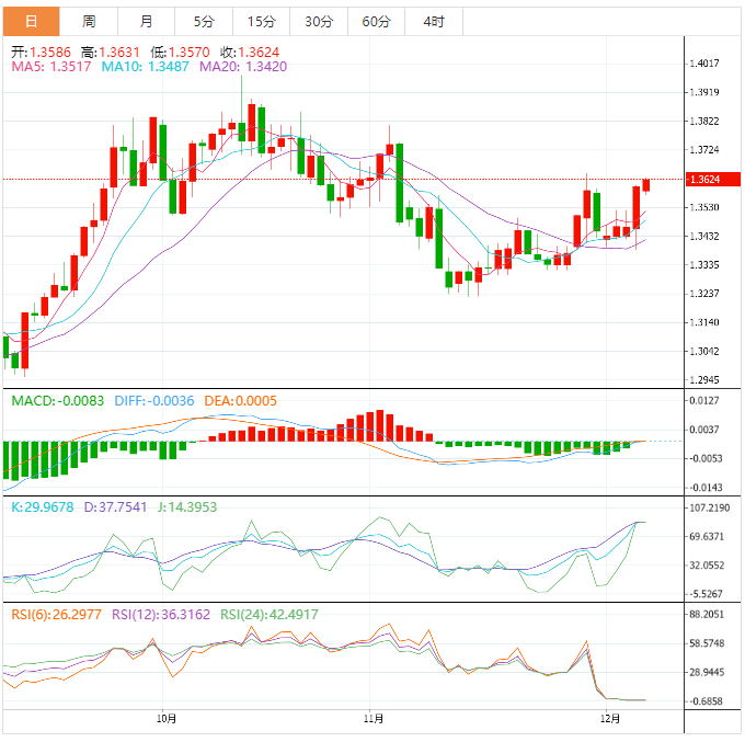 美元兑加元在11月跌至1.3225低点后,一直处于看涨趋势。当25日移动均线和50日移动均线反弹时,该指数已经超过了标准轴心点。相对强度指数(RSI)已经接近超买水平。仔细一看就会发现,它们的头和肩膀形成了一个倒置的图案。