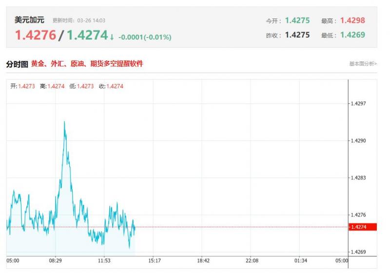 美元兑加元今日汇率最高1.4274 ,最低1.4273 ,涨跌-0.0001 ,涨跌幅-0.01% 。