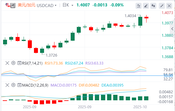 若出现看跌情景,即汇率回落至200日简单移动平均线1.3976下方,市场焦点将转向20日和50日简单移动平均线,对应支撑位分别为1.3887和1.3830。若该区域抛售压力加剧,推动价格跌破通道下轨1.3800,支撑位可能出现在1.3730附近的双底形态区域。