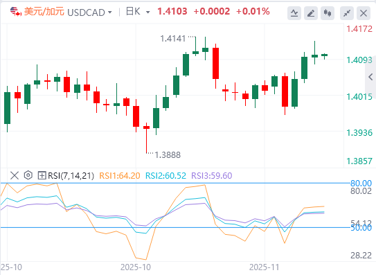 下行方面,初始支撑位于九日均线平均线1.4062。若跌破该水平,将削弱短期价格动能,促使USD/CAD对测试上升通道的下限,约1.4000心理水平,随后触及50日均线1.3982。